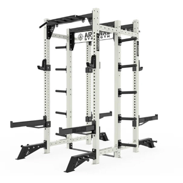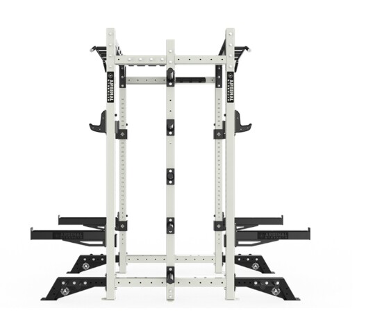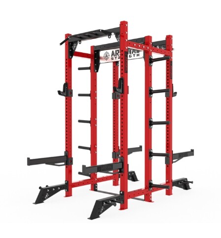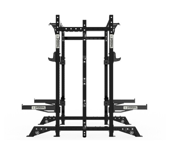 The Arsenal Strength Alpha Series 11 Gauge Racks are comprised of 3×3 11 gauge uprights, 2 inch incremental height adjustments, a customizable, standard bar storage, band pegs, and multi grip pull up crossbars are highlights of this series. Available in Half Rack, Power Rack, and Double Half Rack options.